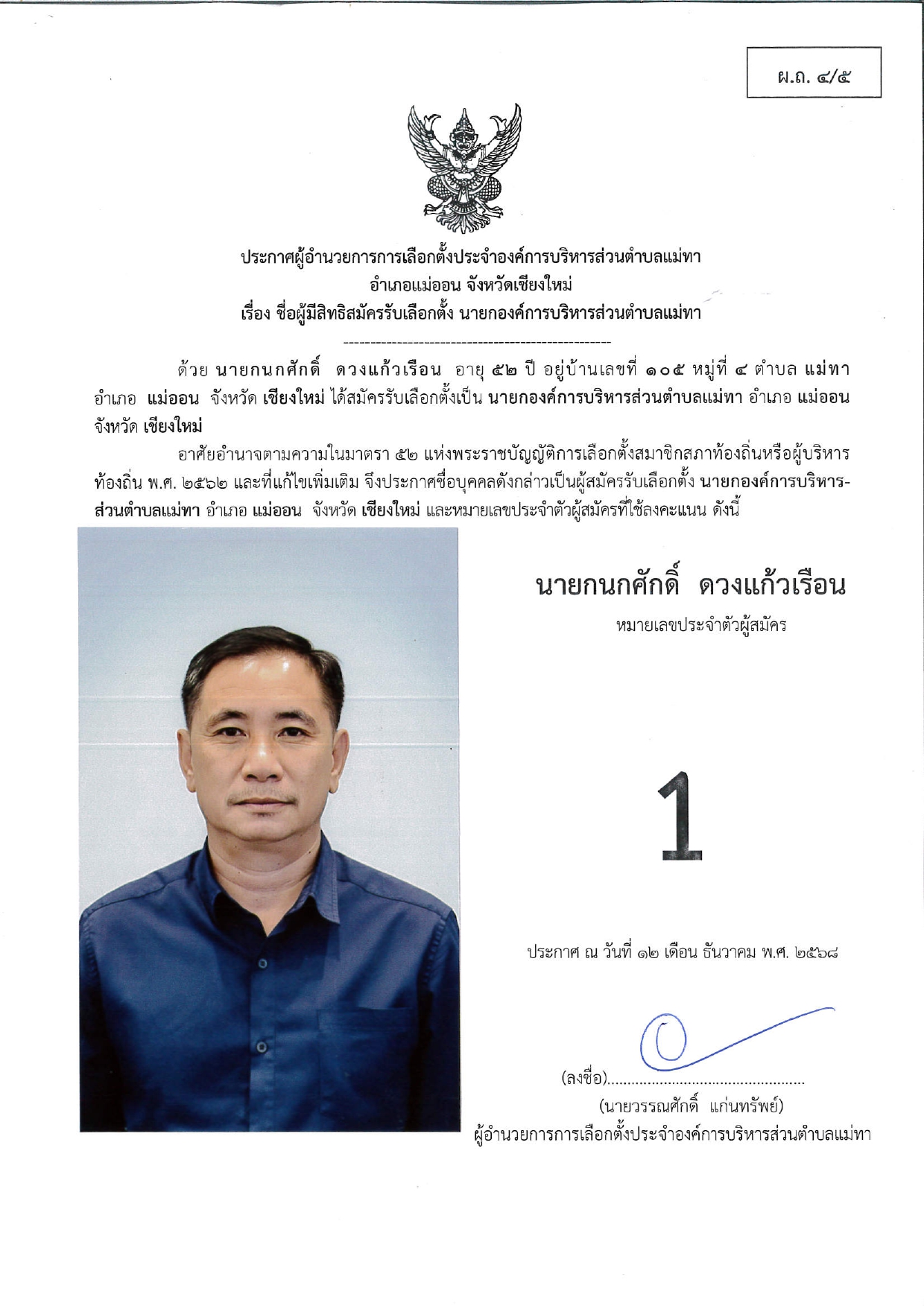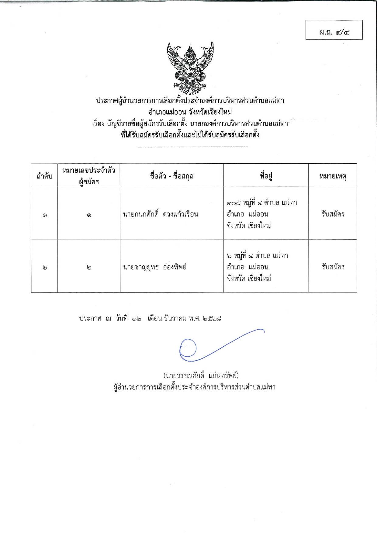 เรื่อง บัญชีรายชื่อผู้สมัครรับเลือกตั้งนายกองค์การบริหารส่วนตำบลแม่ทา ที่ได้รับสมัครรับเลือกตั้ง และไม่ได้รับสมัครรับเลือกตั้ง